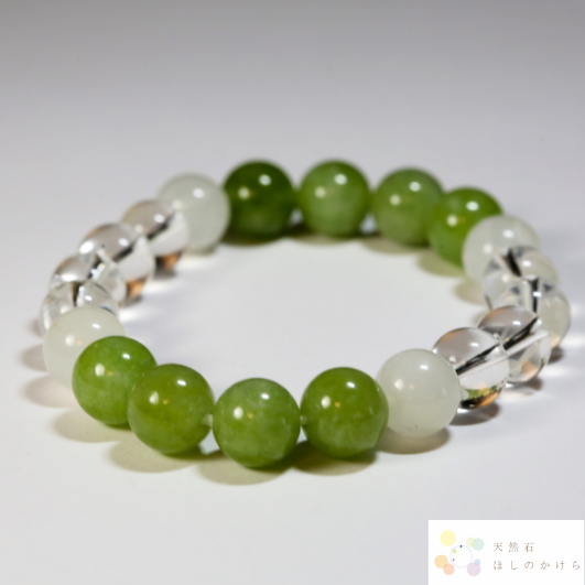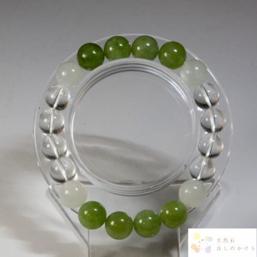 ペリドットとムーンストーン、水晶を組み合わせた、透明感あふれるブレスレットです。爽やかなグリーンと神秘的な乳白色、そしてクリアな輝きが、手元を美しく彩ります。
